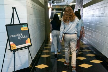 Job fair signage as job seekers arrive at the Appalachian State University…