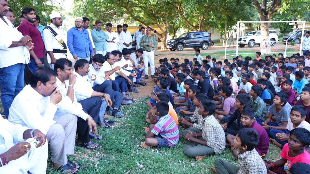 Andhra Pradesh Social Welfare Minister Dola Sree Bala Veeranjaneya Swamy along with Markapuram MLA Kandula Narayana Reddy and other local leaders, speaking to the students of Dr. B. R. Ambedkar Gurukul School in Veligonda, Prakasam district on Monday evening.