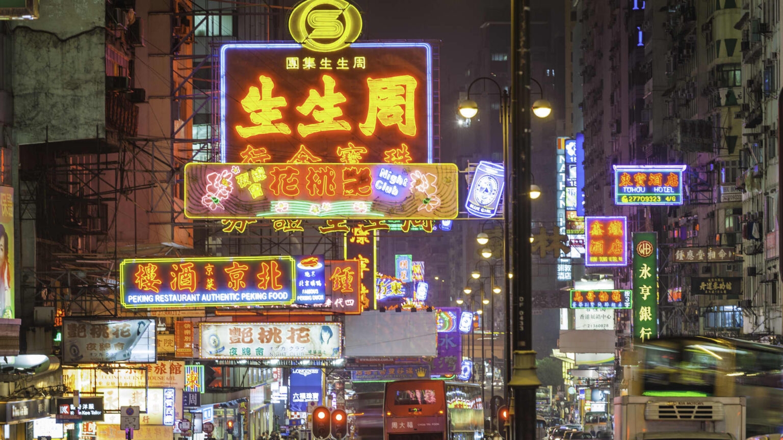 Vibrant neon signs and bright street lights glowing above the busy night traffic of taxis, double decker buses and pedestrians along Nathan Road in the crowded Tsim Sha Tsui district of Kowloon, Hong Kong, China.