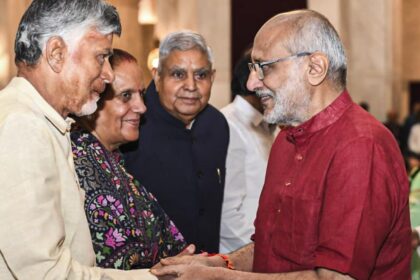 Chief Minister N. Chandrababu Naidu greeting C.P. Radhakrishnan on being sworn in…