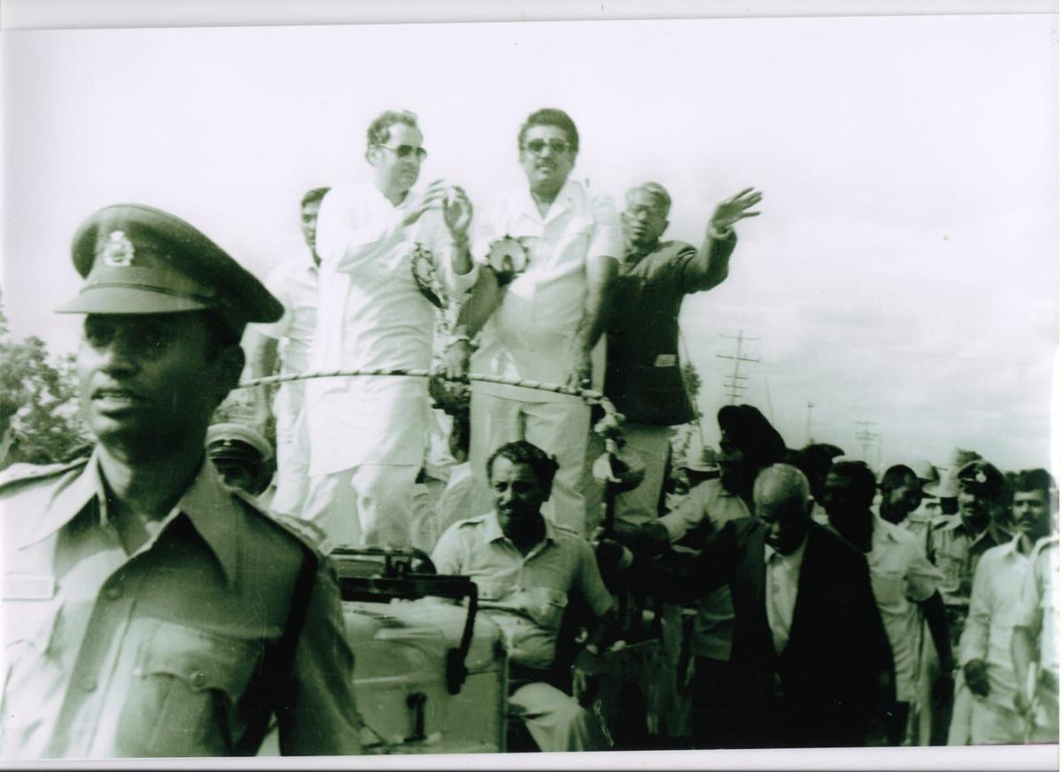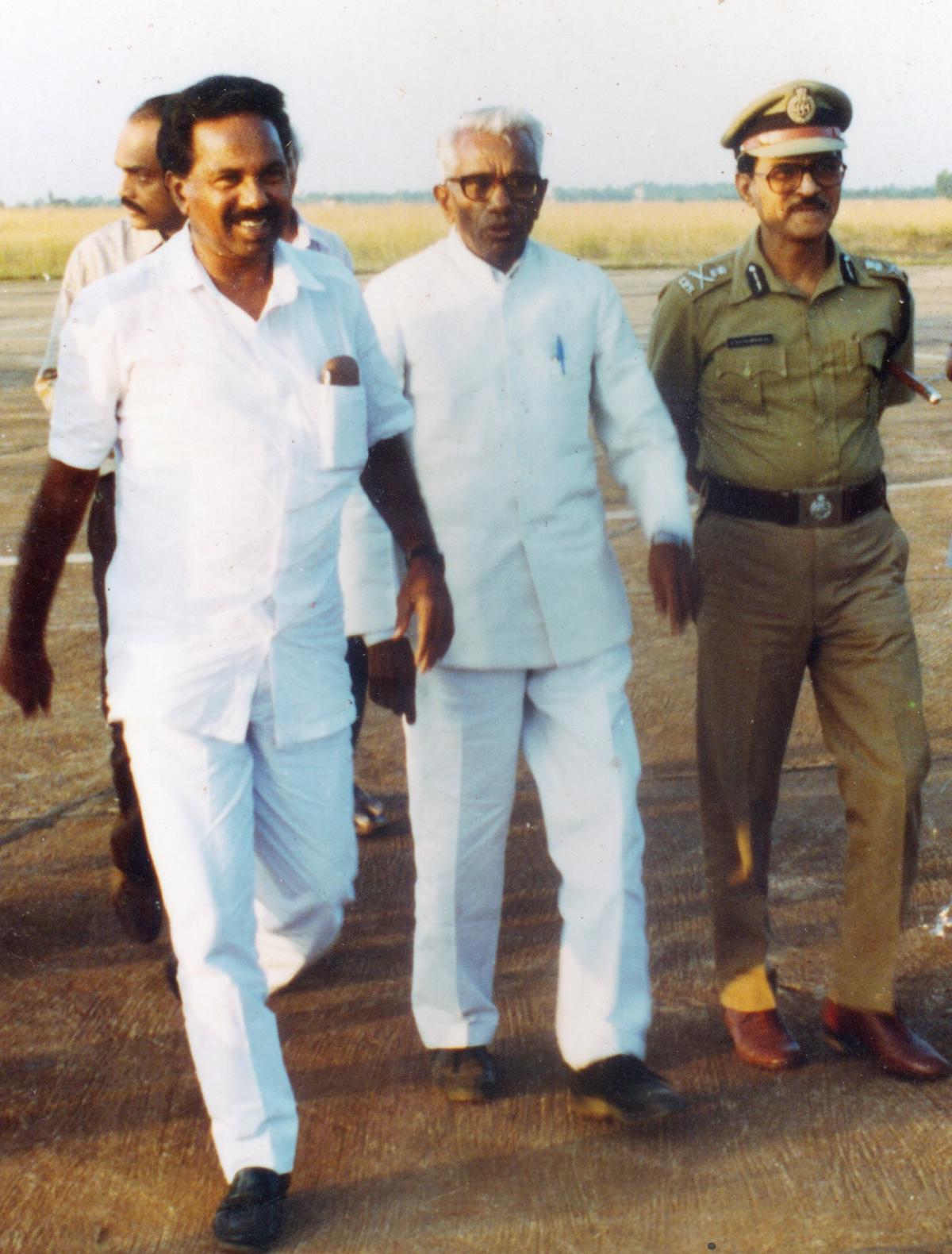 Former Prime Minister Rajiv Gandhi with former Karnataka Chief Minister Gundu Rao and Bheemanna Khandre
