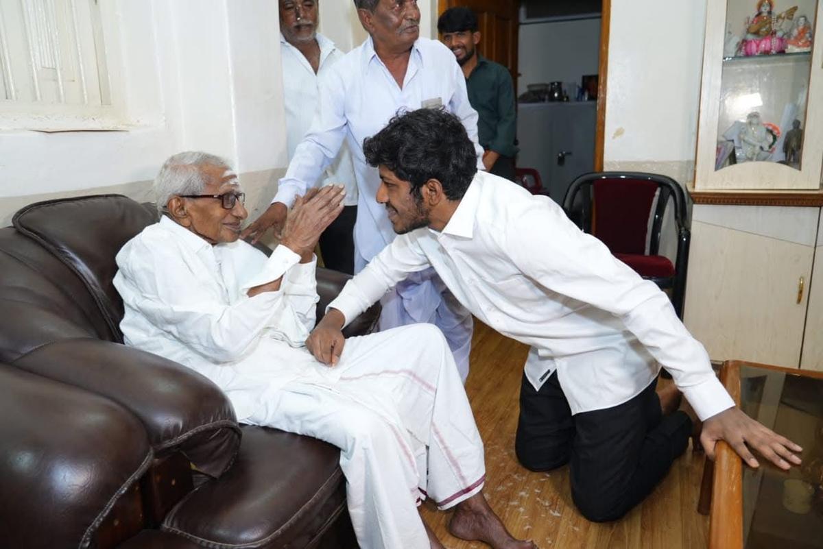 Bheemanna Khandre greeting grandson Sagar Eshwar Khandre who is the Lok Sabha member from Bidar