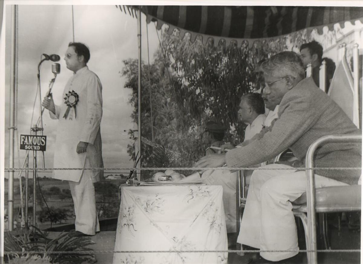 Former PM Rajiv Gandhi addressing a gathering with Bheemanna Khandre (right)