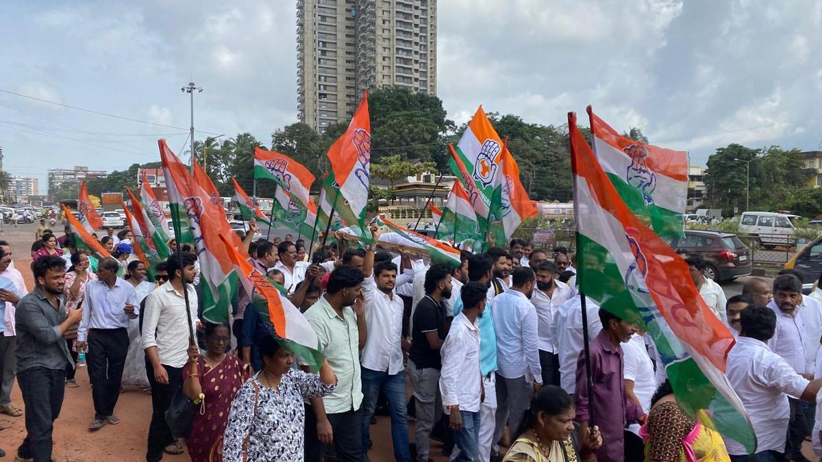 Members of the Dakshina Kannada District Congress unit held a demonstration and conducted a mock funeral procession protesting the pathetic condition of Kochi-Panvel National Highway 66 between Baikampady and Nanthoor in the city on Friday, September 22.