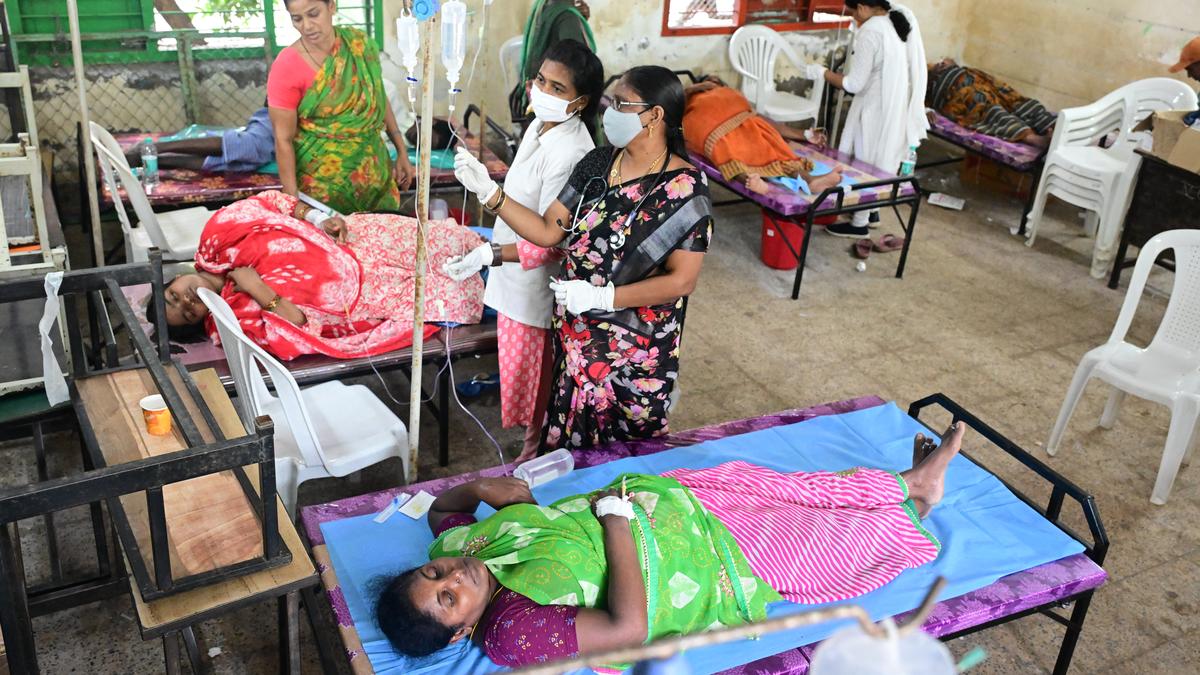 At the medical camp set up at the Care and Share V.M.C. School in New Rajarajeswaripeta, people kept trickling in with symptoms including stomach pain, diarrhoea, vomiting and fever and cough. Six beds, all of them occupied, were placed in the classroom-turned-camp.