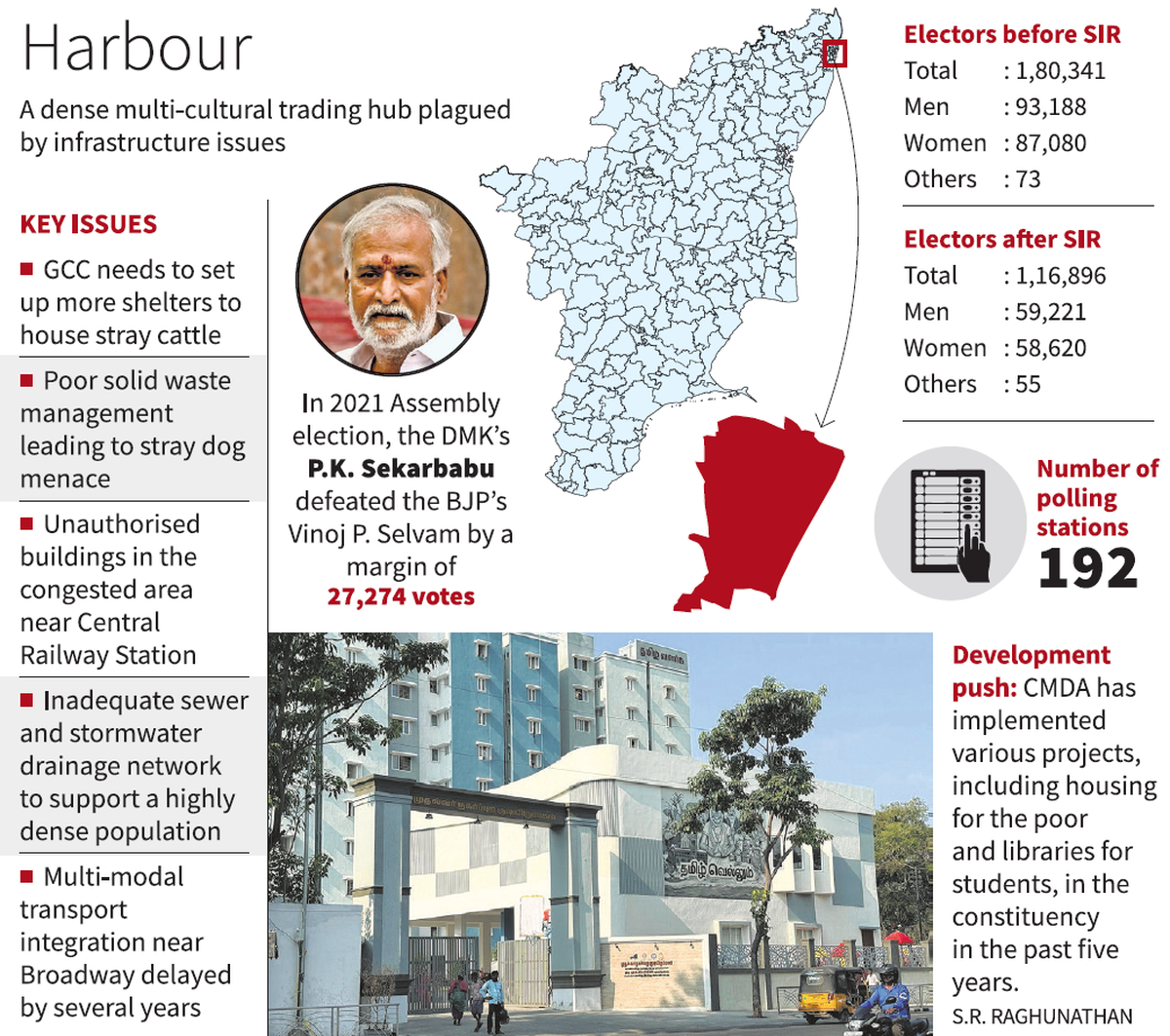 “All the local BJP functionaries are frustrated as the saffron party has not been able to contest from the constituency. As the TVK is likely to split votes, BJP had a chance of winning this time. In the previous election, BJP had registered the lead in ward 57 and 54 where north Indian electors are in significant numbers. In wards 54, 54, 57 and 59, BJP came second. In ward 55, SDPI came third,” said D. Ravi, a functionary of the BJP. Over 25,000 Muslim electors and 28,000 north Indian electors are crucial for the winning candidate. During SIR, over 12,000 names of electors from northern States were removed in Harbour Assembly constituency, reducing the number from 40,000 to around 28,000. A total of 63,445 names were removed from the rolls in SIR.