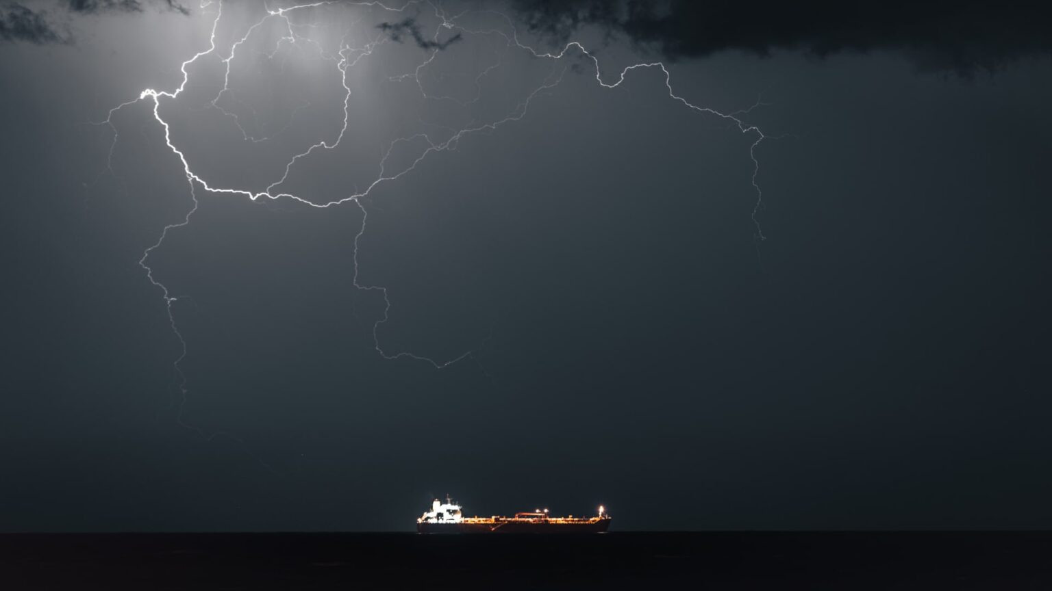 Lightning occurs when META 4, an Oil Products Tanker, sails into Muscat Anchorage on March 21, 2026 at Sultan Qaboos Port in Muscat, Oman.