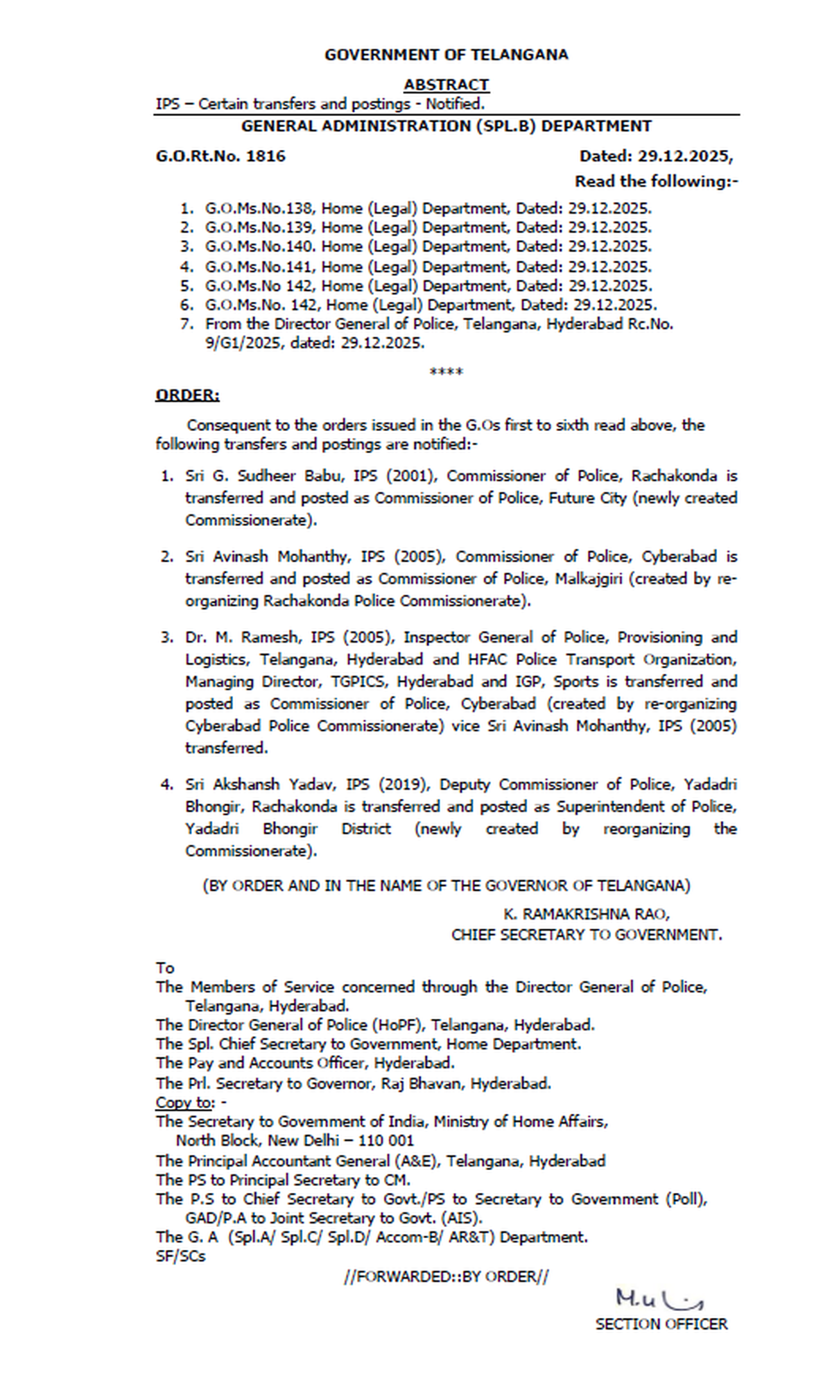 The government also issued formal orders appointing Police Commissioners for all four commissionerates and an SP for Yadadri Bhuvanagiri district.