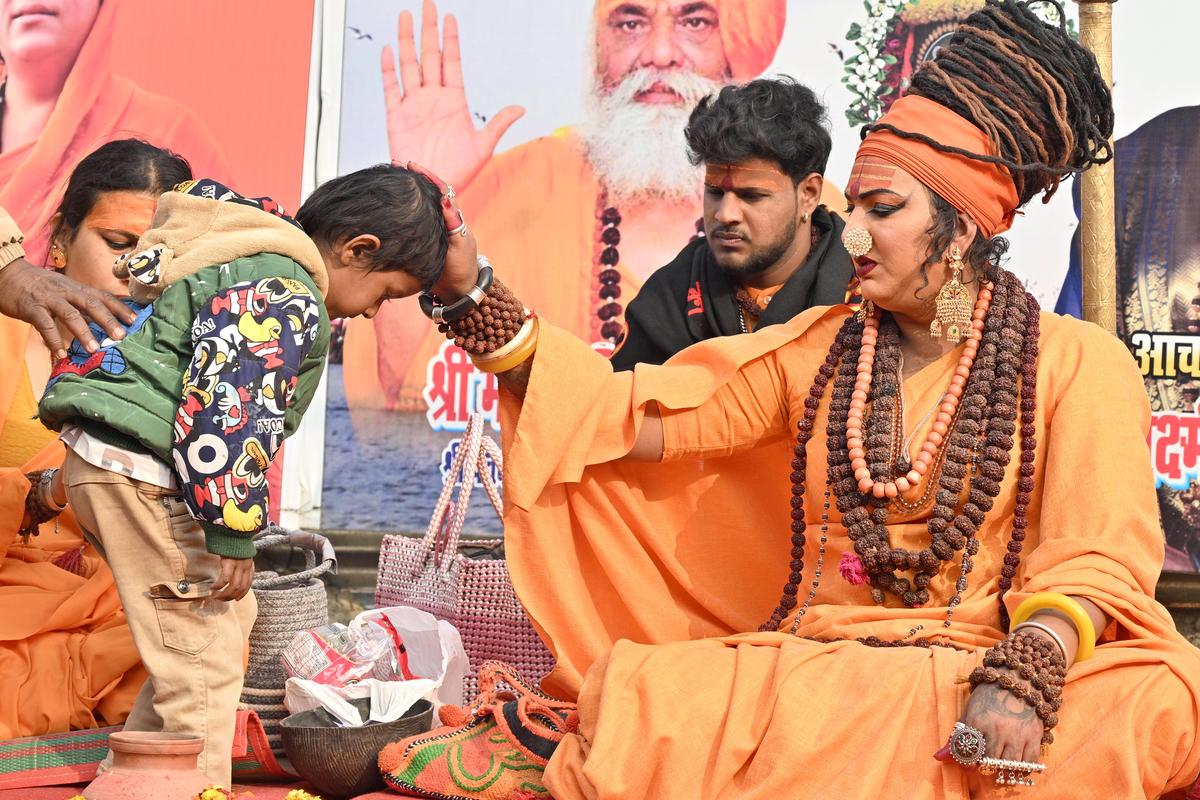 Inclusive faith: A kinnar saint at the religious gathering blesses a child.