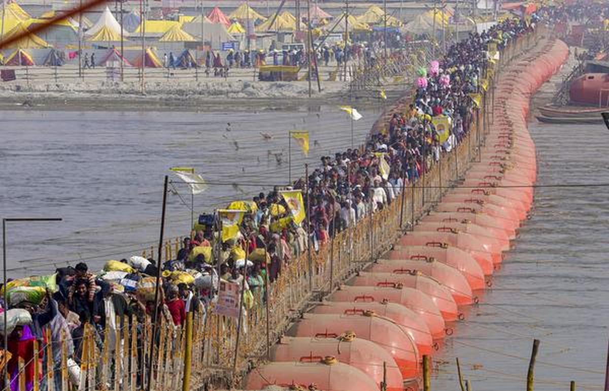 Chanelling the faithful: Devotees atop a pontoon bridge at the mela on their way to take the holy dip ahead of the Mauni Amavasya festival.