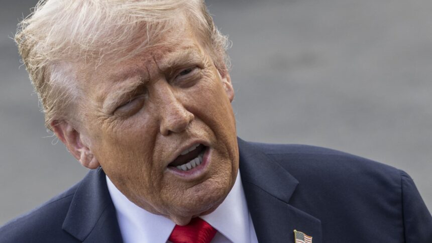 U.S. President Donald Trump speaks to the media before boarding Marine One on the South…