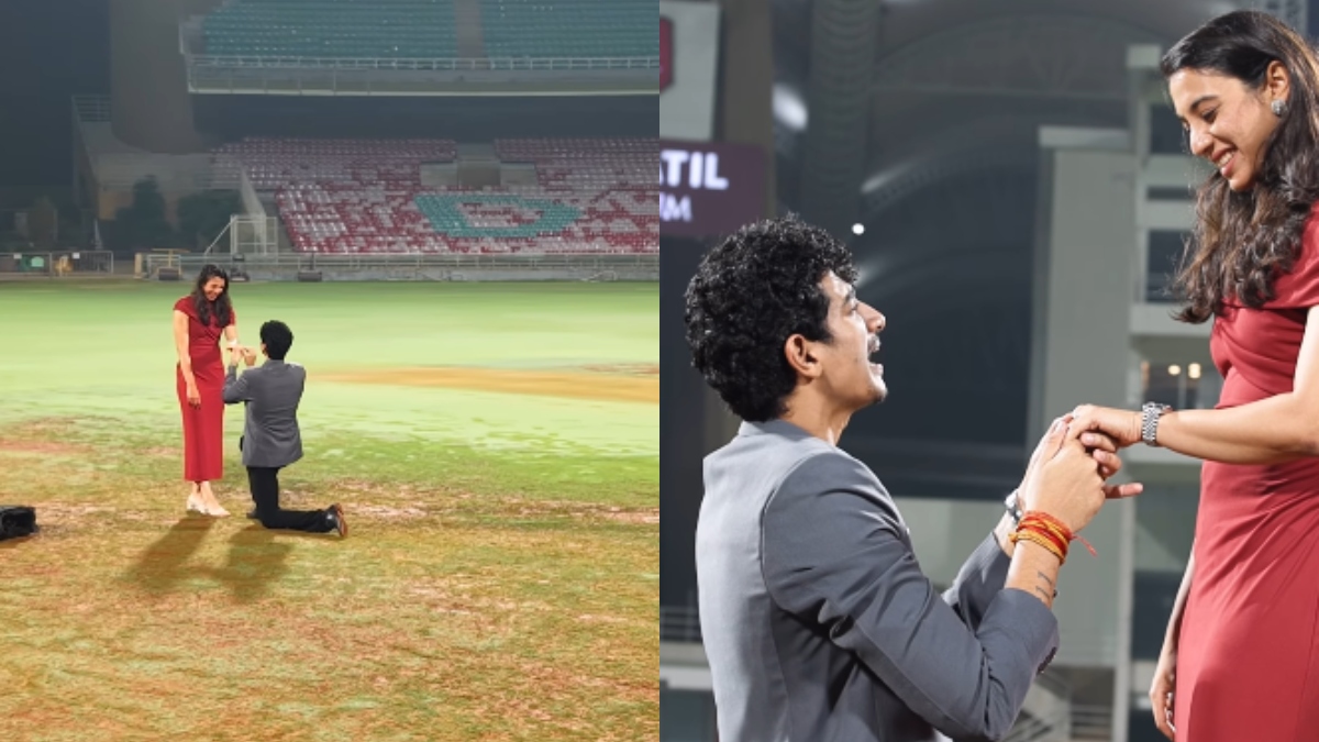 • Palash Muchhal shared a video where he can be seen proposing to Smriti Mandhana at the DY Patil Stadium of Navi Mumbai with a ‘She said yes,’ caption.