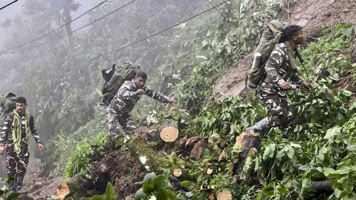 Rescue operation underway after incessant rain triggered a landslide in the Upper Rimbi area around midnight, in Gyalshing, Sikkim, Friday, Sept. 12, 2025. Four killed, one injured in the incident.