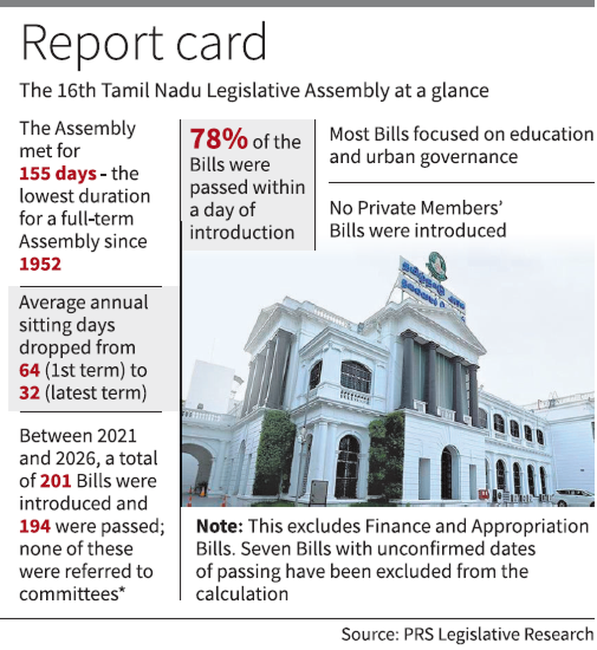 The average annual sitting days of the Tamil Nadu Legislative Assembly reduced by half, from 64 days during the first term (1952-57) to 32 days during the latest 16th term (2021-26), according to an analysis by PRS Legislative Research, an independent research body.
