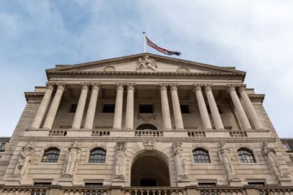 A Union flag flutters from a pole atop the Bank of England,…