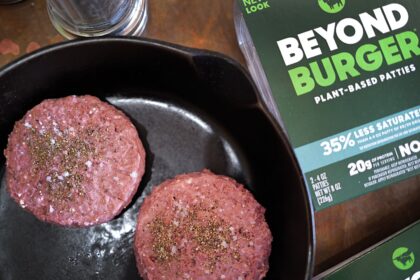 In this photo illustration, Beyond Meat's Beyond Burgers are shown on February…