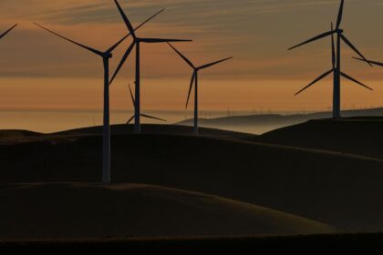 An aerial view of wind turbines at the Altamont Pass wind farm…