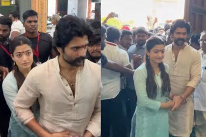 Vijay Deverakonda shields wife Rashmika as they get mobbed at temple while celebrating 1-month anniversary