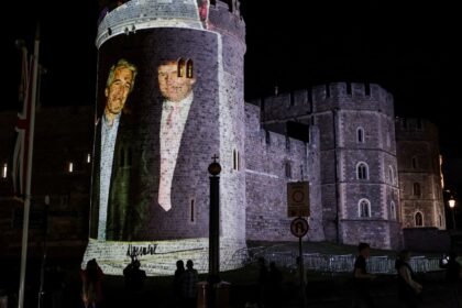 Trump and Jeffrey Epstein image projected on Windsor Castle