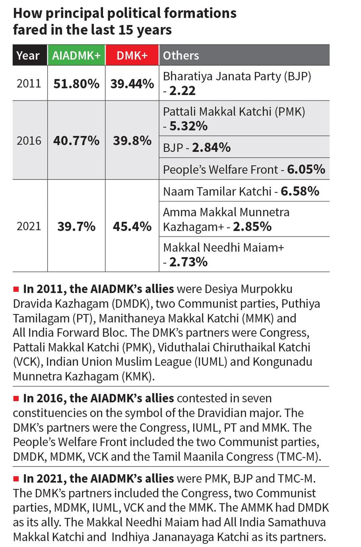 As far as the AIADMK-led NDA is concerned, it has almost been one year since the Dravidian major and the BJP announced the revival of their ties. The two had contested in the 2024 Lok Sabha election on their own, having their respective fronts but the end result — all the 39 constituencies going in favour of the SPA — had forced the two to come together again. Over the months, there were dramatic turns such as the exit of the Amma Makkal Munnetra Kazhagam (AMMK), headed by T.T.V. Dhinakaran, from the NDA in September 2025 and, four months later, its “homecoming.” Another open supporter of the BJP, Mr. Panneerselvam found himself in an awkward position owing to AIADMK general secretary Edappadi K. Palaniswami’s firm refusal to accommodate him. He did what he would not have imagined even 10 years ago — joining the AIADMK’s traditional adversary, the DMK. The Pattali Makkal Katchi (PMK), an ally of the BJP in the 2024 polls, has suffered a split with founder S. Ramadoss and his son and former Union Minister Anbumani Ramadoss falling apart. Dr. Anbumani is now a constituent of the NDA. Other parties, including the Tamil Maanila  Congress (Moopanar), are expected to be accommodated in the NDA.