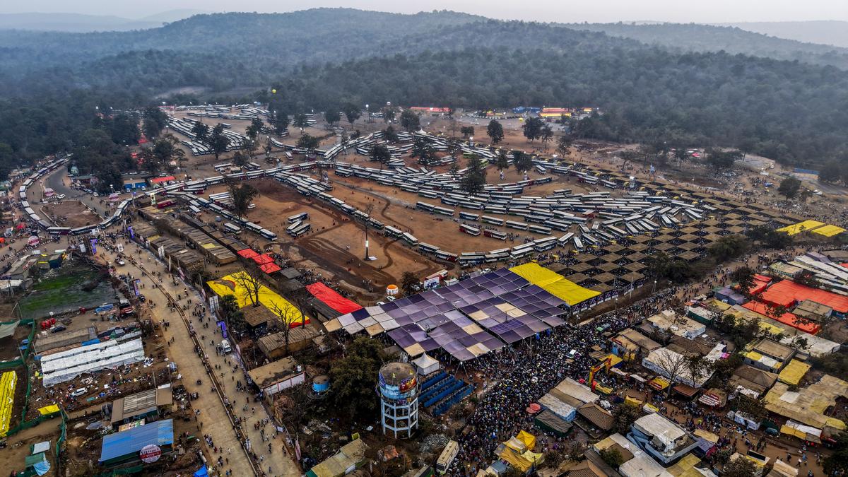Bustling hub: A vast congregation fills Medaram village during the Maha Jatara, one of the largest tribal gatherings in the country.
