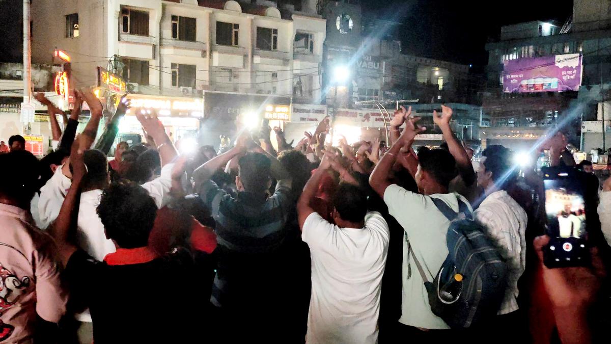 People raise religious slogans after the Shri Mata Vaishno Devi Shrine Board announced the resumption of pilgrimage to Mata Vaishno Devi shrine from September 17, 2025, after a 22-day halt, in Jammu and Kashmir, on September 16, 2025.