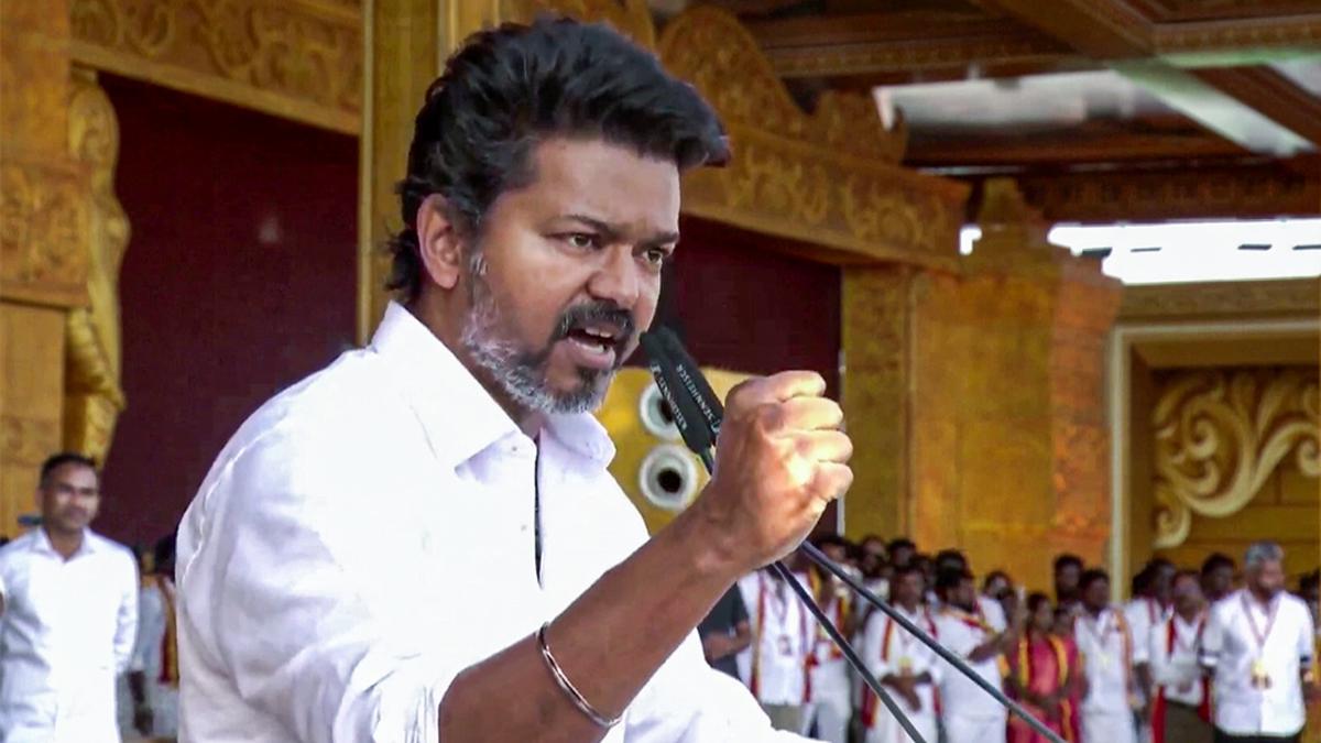 Actor and founder of Tamilaga Vettri Kazhagam (TVK), Vijay addresses the gathering during the party’s conference in Madurai. (File photo)