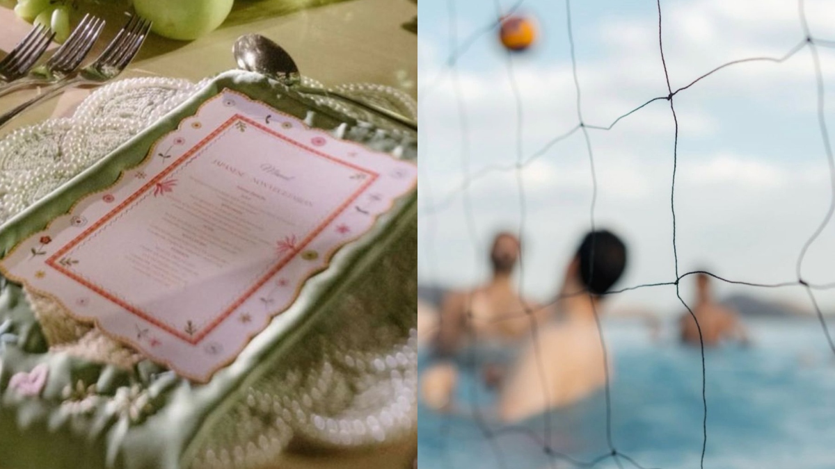 Vijay posted a picture shot through a volleyball net with players silhouetted in the pool and a ball in mid-air, hinting at a game in full swing. Another picture showed a floating drink station with red cups and a panoramic landscape in the background, before the VIROSH wedding.